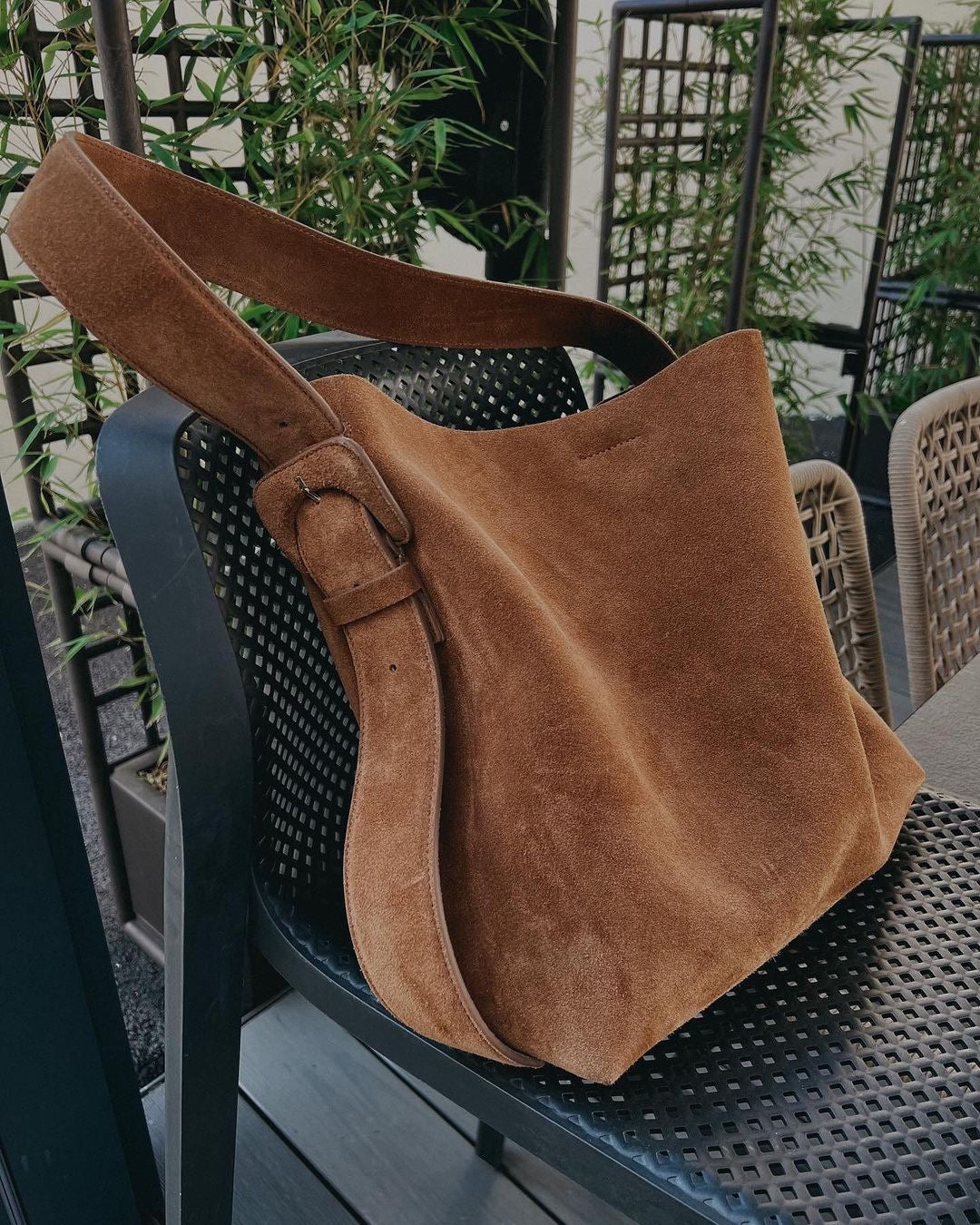 La nuova tracolla in camoscio color cioccolato, così sportiva ma allo stesso tempo chic, è l’accessorio perfetto per dare un tocco sofisticato anche al look più casual.”