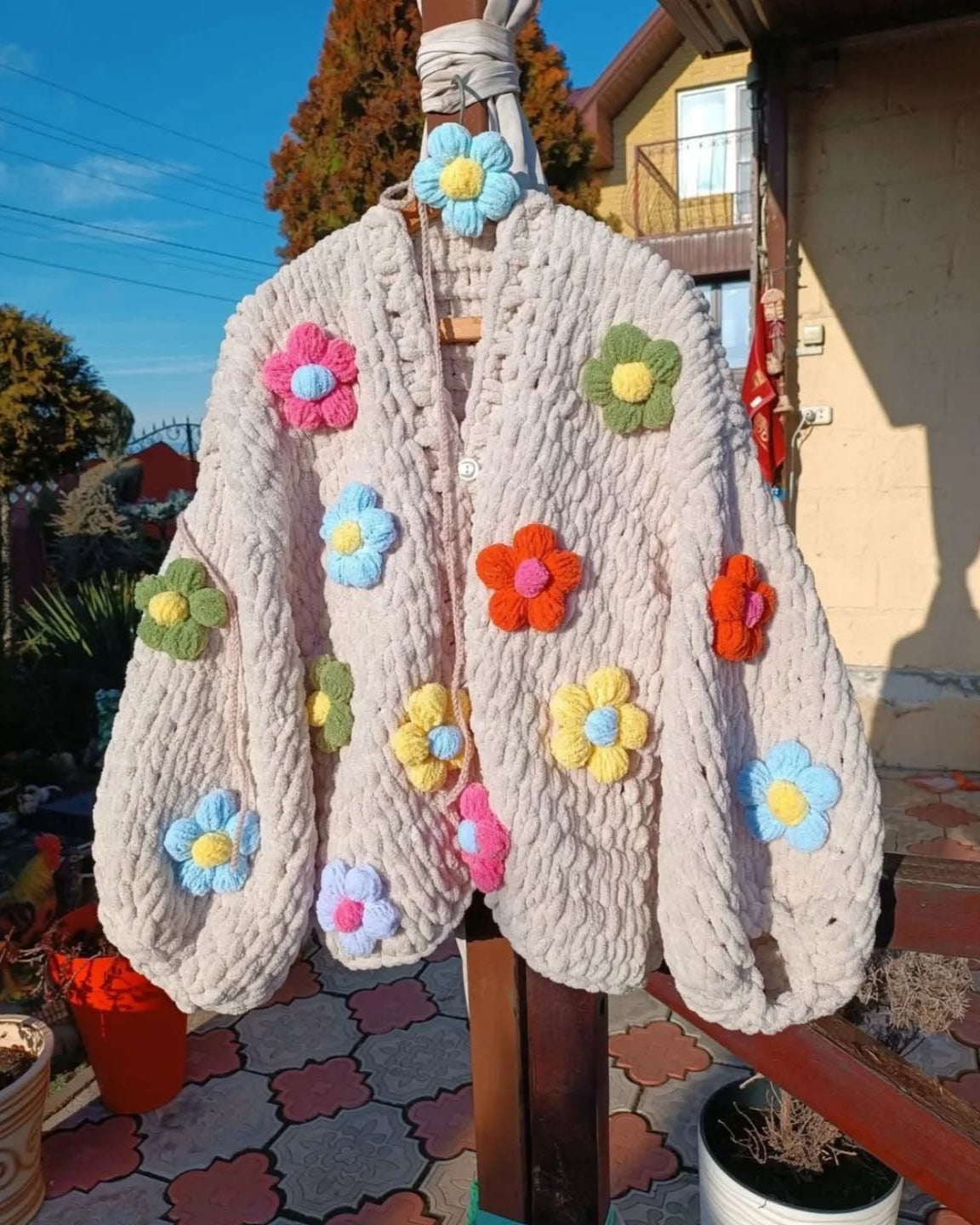 Cardigan completamente fatto a mano, impreziosito da delicate margherite che donano un tocco romantico e senza tempo.”